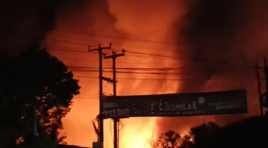 Asap tebal membubung tinggi ke angkasa, terlihat jelas dari kejauhan. Warga di sekitar lokasi diimbau untuk tetap tenang dan menghindari area kebakaran demi keselamatan.