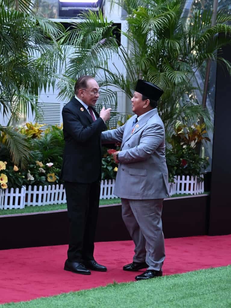Kedua pemimpin tampak bersalaman erat dan berpelukan hangat yang menunjukkan keakraban dan hubungan persahabatan yang terjalin baik. Setelahnya, Presiden Prabowo dan PM Anwar mengabadikan momen ini dalam sebuah foto bersama sebelum Kepala Negara menuju ruang tunggu untuk bergabung dengan pemimpin negara lainnya yang hadir dalam konferensi ini.