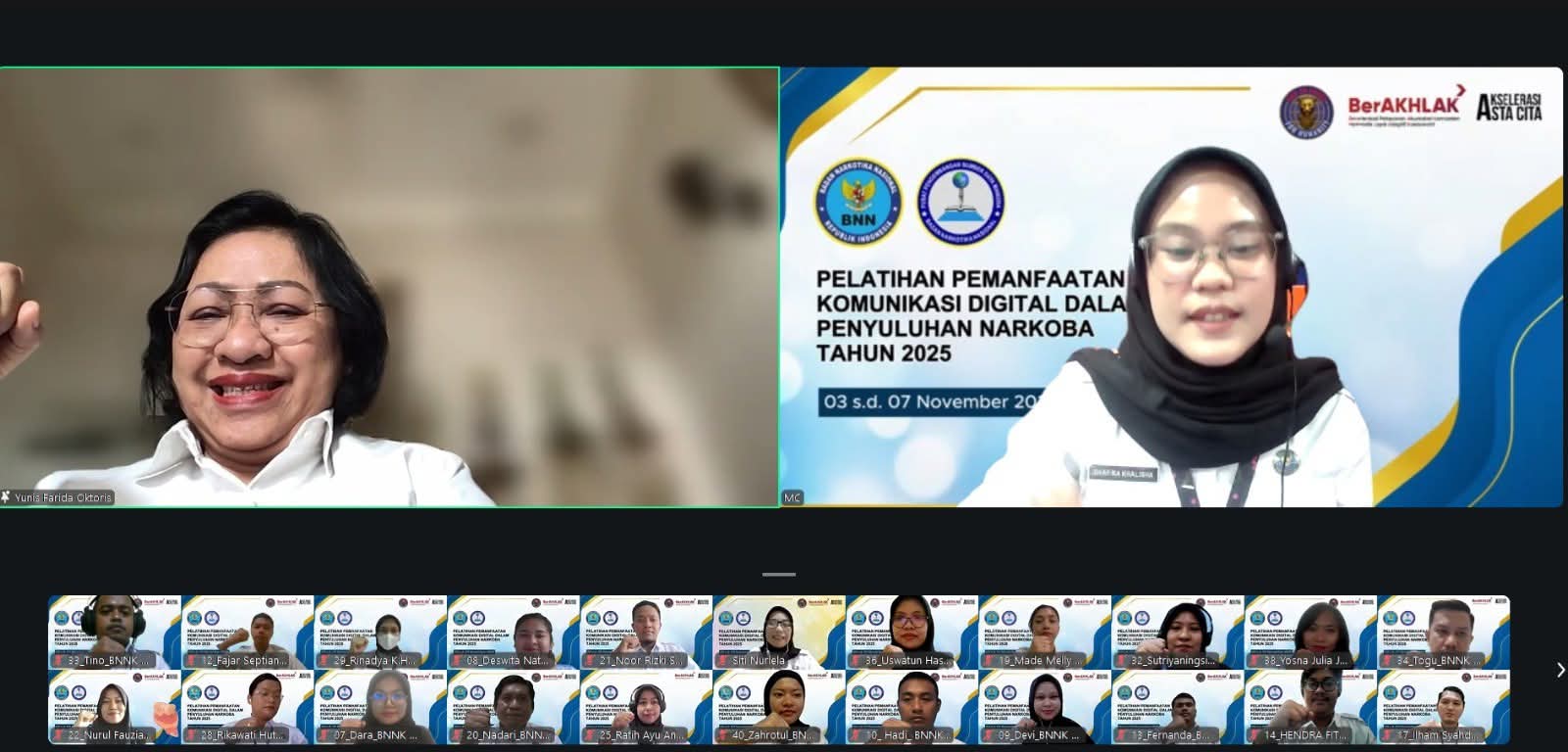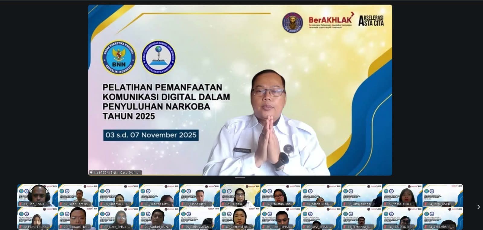 Mutiaraindotv.my.id – Badan Narkotika Nasional (BNN) melalui Pusat Pengembangan Sumber Daya Manusia (PPSDM) menggelar Pelatihan Pemanfaatan Komunikasi Digital dalam Penyuluhan Narkoba Tahun 2025. Kegiatan ini dilaksanakan secara virtual pada 3 s.d. 7 November 2025 dan diikuti oleh 40 peserta dari berbagai wilayah di Indonesia.