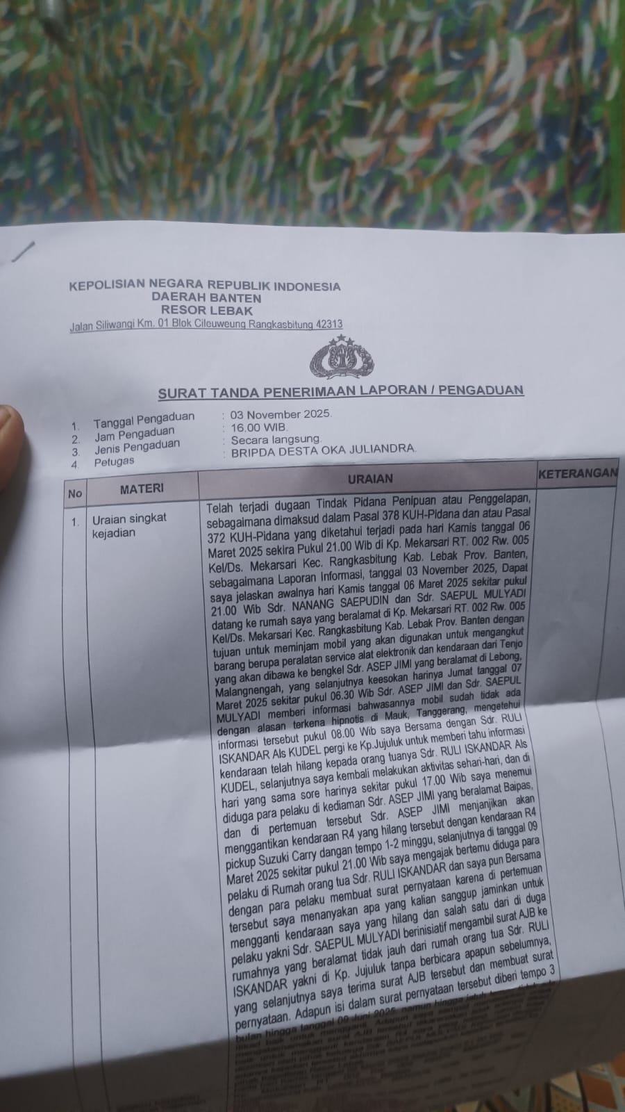 Didalam Surat Laporan dari Polres Lebak. tersebut tidak sesuai fakta,(1)Asep Jimi tidak menjanjikan untuk menggantikan kendaran R4 yang hilang, sedangkan yang minjem dan yang mengilangkan itu Nanang Saepudin, tutur asep jimi pada awak media, (7/11/2025)