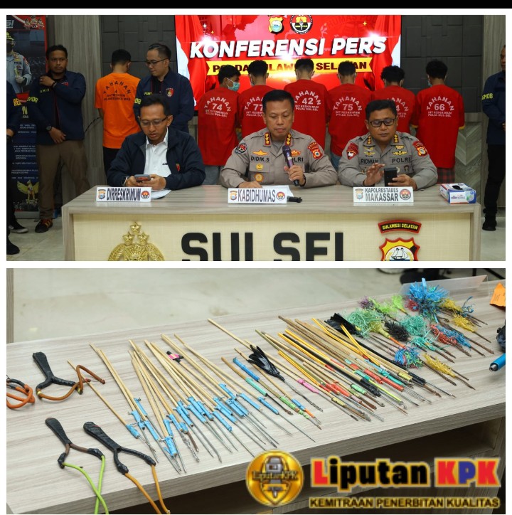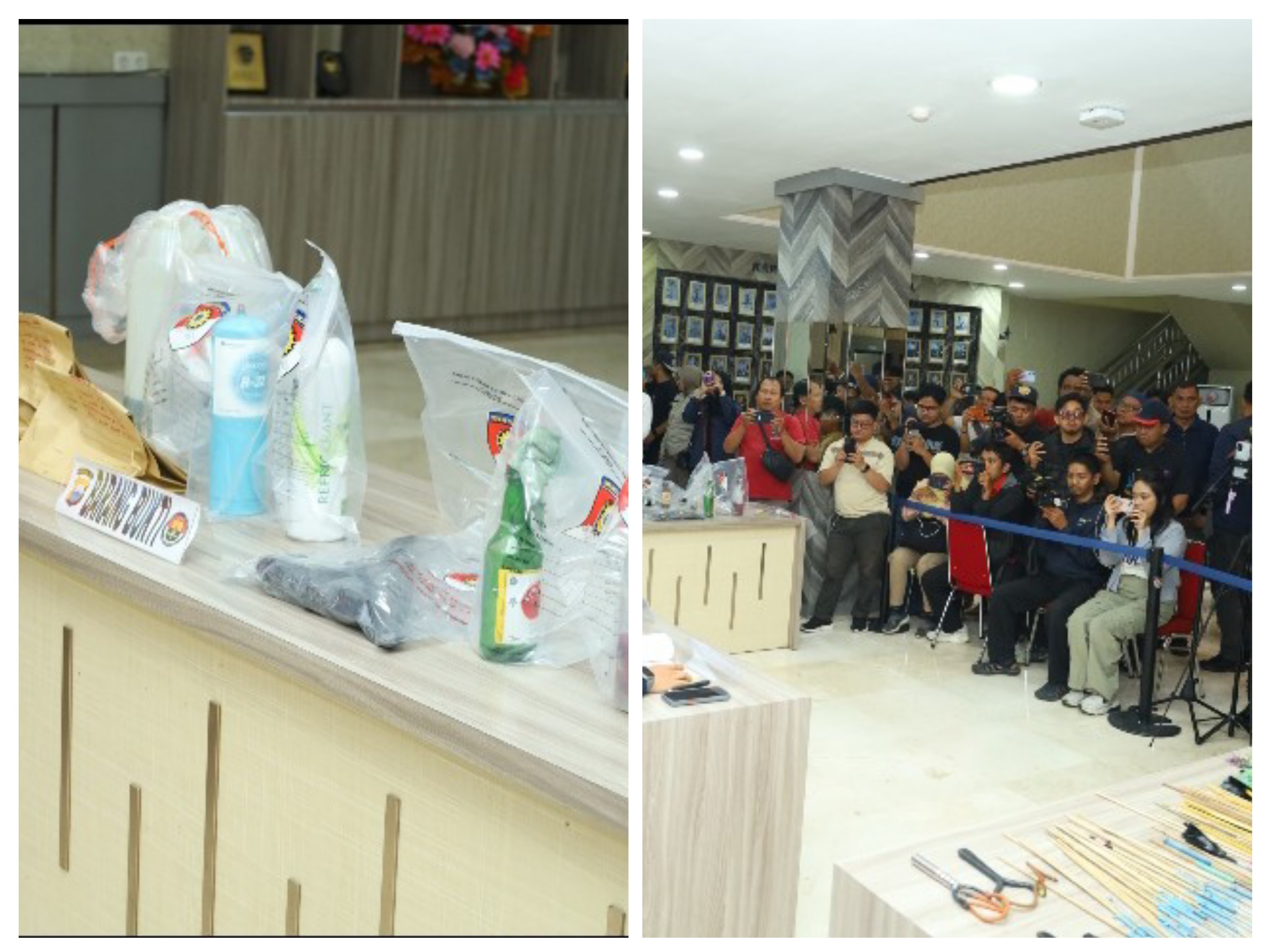Press release dipimpin oleh Kabid Humas Polda Sulsel Kombes Pol. Didik Supranoto, S.I.K., M.H., didampingi Dirreskrimum Polda Sulsel Kombes Pol. Setiadi Sulaksono, S.I.K., M.H., serta Plt Kapolrestabes Makassar Kombes Pol. Muhammad Ridwan, S.I.K., M.H.
