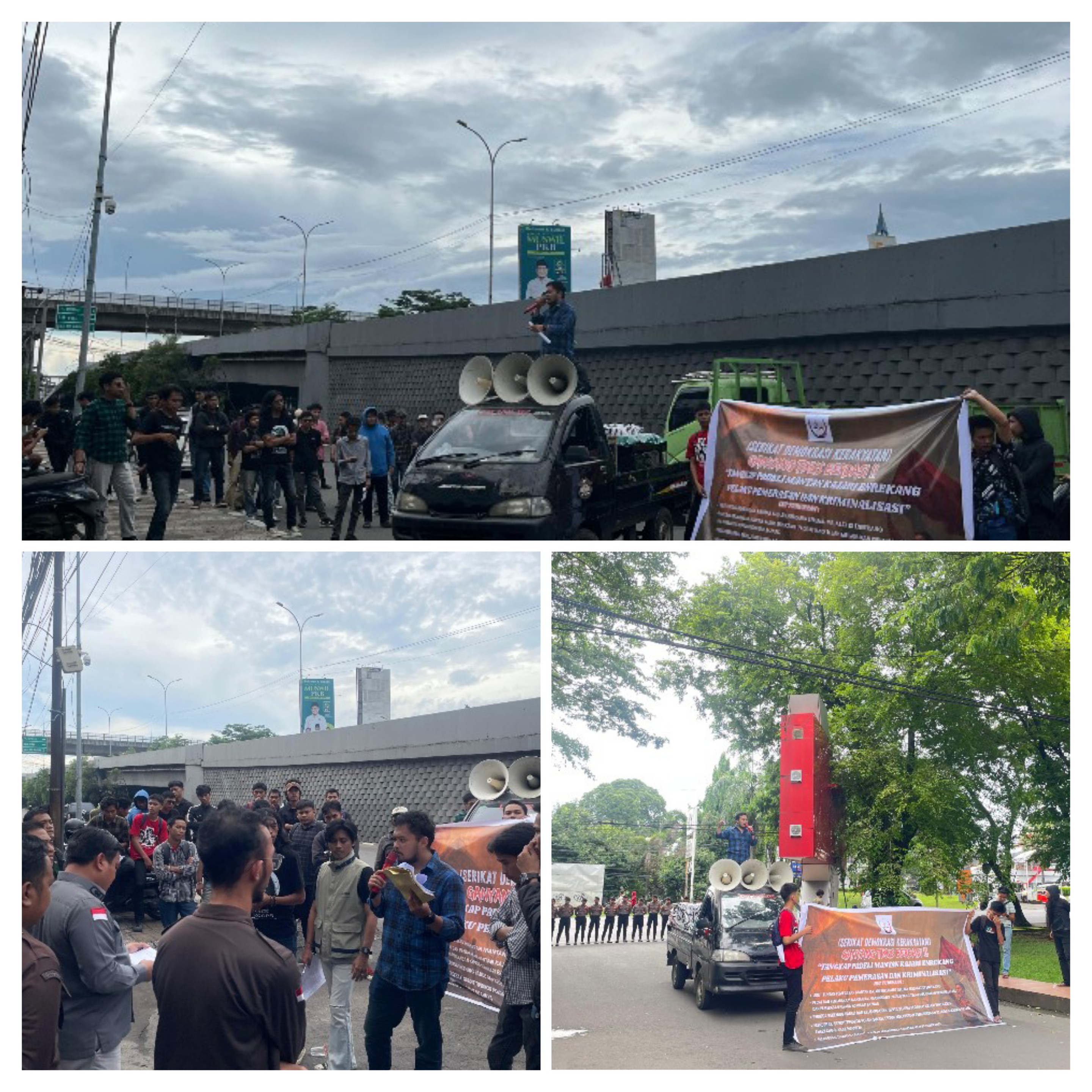 Dalam aksi tersebut, para demonstran membentangkan spanduk bertuliskan “Tangkap Padeli Mantan Kajari Enrekang Pelaku Pemerasan dan Kriminalisasi” sambil melakukan orasi dari atas mobil komando.