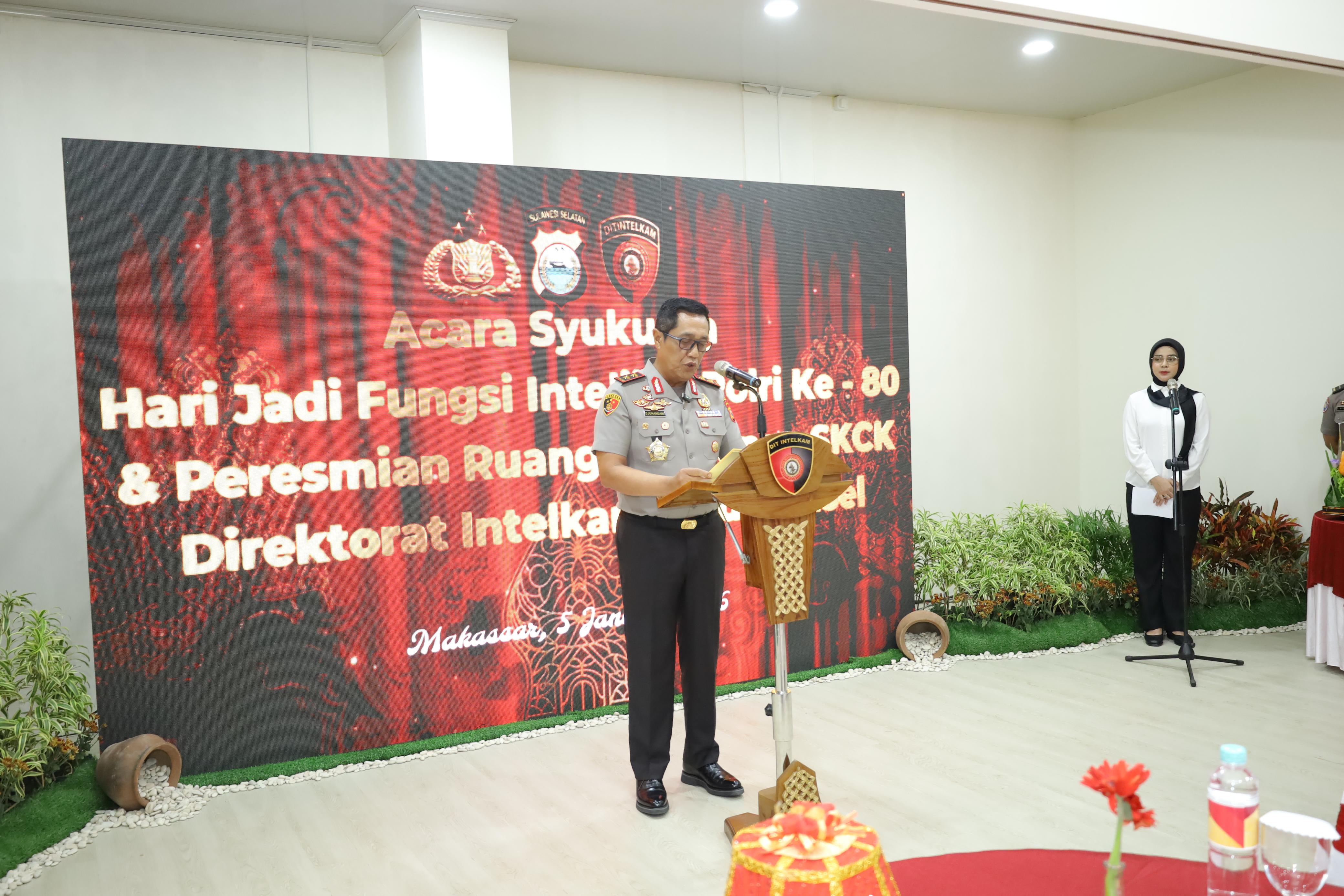 Kapolda Sulawesi Selatan Irjen Pol. Djuhandhani Rahardjo Puro, S.H., M.H., menghadiri kegiatan syukuran Hari Jadi ke-80 Fungsi Intelijen Polri yang dirangkaikan dengan peresmian Ruang Pelayanan SKCK Direktorat Intelkam Polda Sulsel, Senin (05/01/2026).