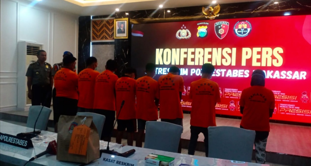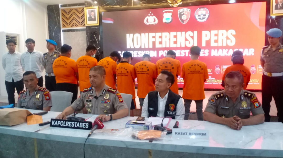 Konferensi pers dipimpin Kapolrestabes Makassar Kombes Pol. Arya Perdana, SH, SIK, M.Si, didampingi Kasatreskrim AKBP Devi Sujana, SH, SIK, MH, serta Kasihumas AKP Wahiduddin, Ramli, dan jajaran.