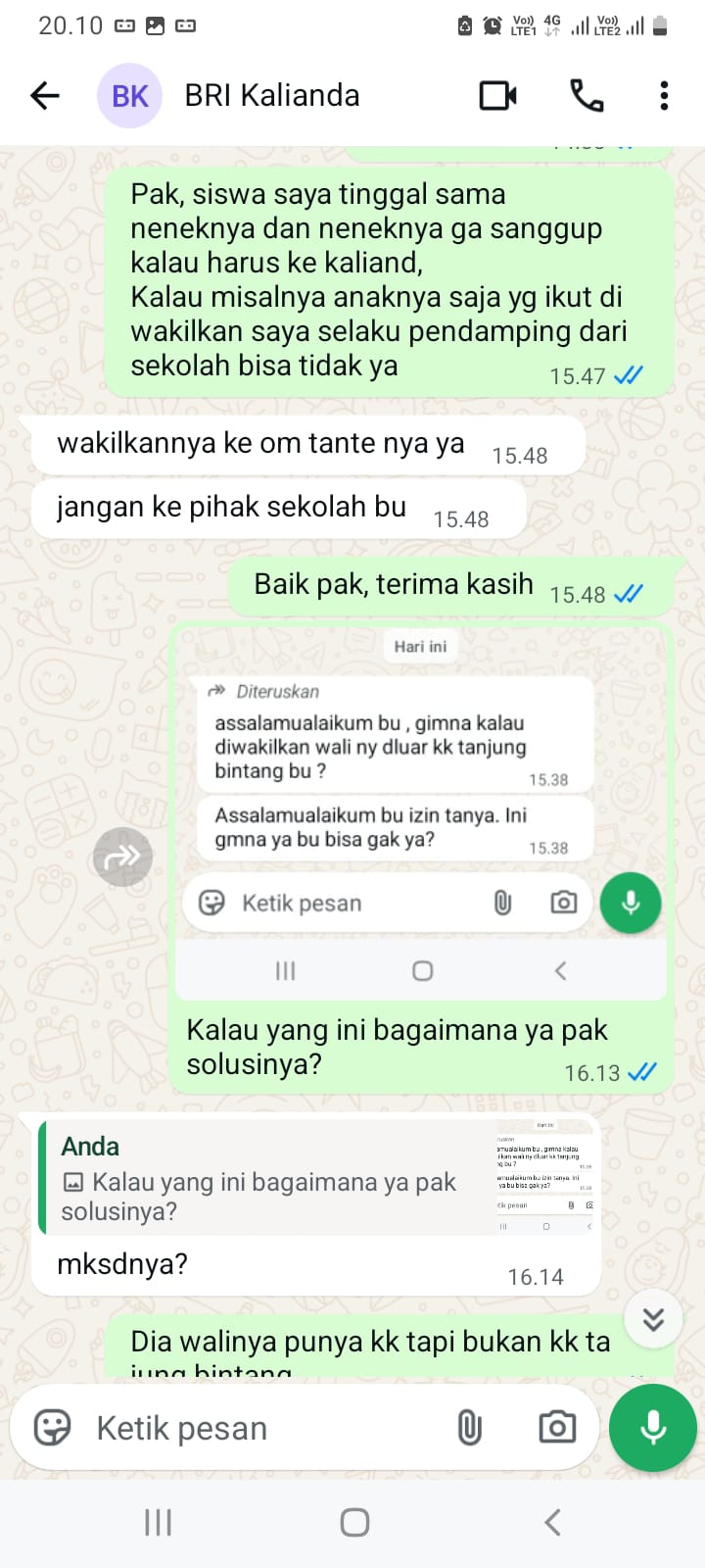 Ketika mau di kuasakan ke guru pendamping yang wajib hadir di bank BRI , Dona selaku guru yang mendampingi , menjawab dengan memberikan screen sut percakapan nya dengan orang bank ,yang mengatakan tidak bisa di kuasakan ke selain keluarganya paman atau ,tantenya