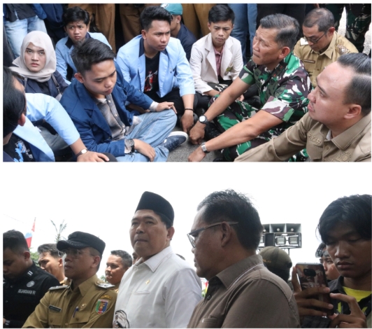 Aspirasi mahasiswa diterima langsung oleh Ketua Komisi I DPRD Provinsi Lampung H. Garinca Reza Pahlevi, S.I.Kom., M.M., bersama Pangdam XXI/Radin Inten Mayjen TNI Kristomei Sianturi, S.Sos., M.Si.(Han). anggota DPRD Provinsi Lampung Mohammad Reza Berawi dan M. Rahmat Visa Ridi Arifin, S.M., serta perwakilan Kejaksaan Tinggi Lampung Diky Kurniawan, didampingi Sekretaris DPRD Provinsi Lampung Descatama Paksi Moeda, S.T., S.E., M.M.
