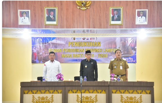 Pengukuhan Dewan Pendidikan Provinsi Lampung masa bakti 2025–2030 ini menetapkan Prof. Syafrimen, M.Ed., Ph.D. sebagai Ketua, didampingi Dr. Asad, S.Ag., S.Hum., M.H., C.Me. sebagai Wakil Ketua, serta Gino, S.Pd., M.H. sebagai Sekretaris, bersama jajaran anggota dari berbagai latar belakang profesional.