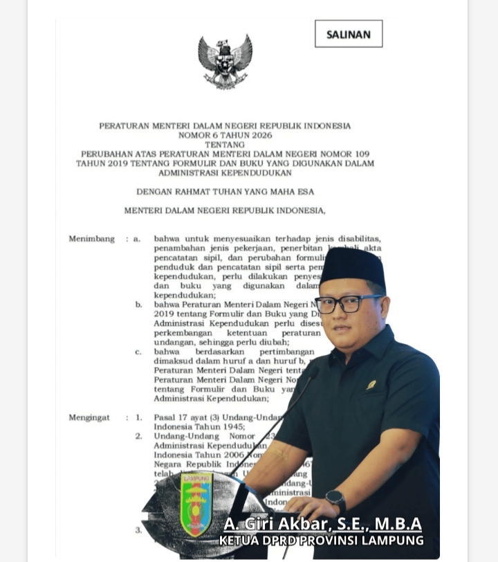 Mutiaraindotv.my.id Bandar Lampung — Ketua DPRD Provinsi Lampung A. Giri Akbar, SE, MBA, mengajak seluruh pemerintah kabupaten dan kota se-Provinsi Lampung untuk segera melakukan sosialisasi serta percepatan implementasi Permendagri Nomor 6 Tahun 2026 sebagai langkah strategis dalam mendorong pemutakhiran data pemerintahan yang akurat, terpadu, dan berkelanjutan, Minggu (26/4/2026)